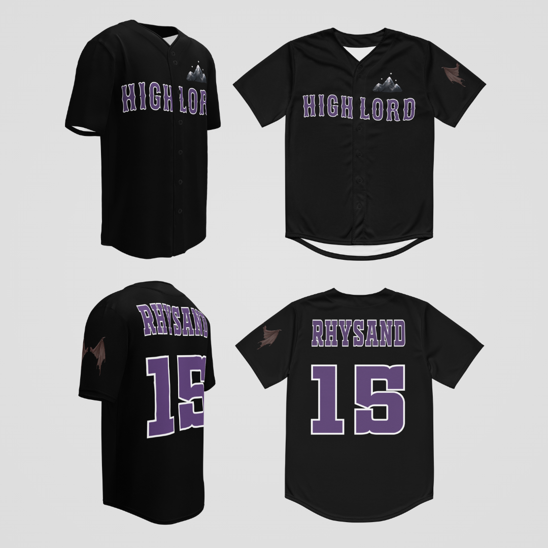 RHYSAND'S BASEBALL JERSEY: features a black jersey color with purple font. Graphics include mountain insignia on front and wings on left sleeve. Number on back matches the 2015 of the ACOTAR release year.